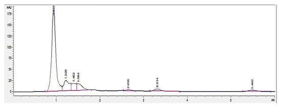 An HPLC analysis of LL extract showed a prominent peak at RT 0.939 min, acquiring the highest height and largest area by percentage. This peak was later identified to represent mimosine based on the HPLC analysis of different concentrations of mimosine that showed an increased peak height at this particular RT as the concentration increased (Figure 3), which was further confirmed by the spiking of LL extract with mimosine that followed the same increasing trend in peak heights at an average of 0.9 min (Figure 4). The second peak in the chromatogram of mimosine alone (Figure 3) might represent a mimosine degradation product or the solvent in which mimosine was dissolved in. The results validate the presence of mimosine in the extract, representing a relatively large proportion compared to the other constituents and opening the possibility of mimosine as the active compound exhibiting pharmacological activities in the LL plant. HPLC analyses of mimosine have been conducted by several studies that showed the mimosine peak to appear at an RT of about 2 to 3 min [35,43,51]. Although these studies do not agree with our finding, this noticeable difference in RTs was mainly due to the use of different mobile phases in these studies, whereby either orthophosphoric acid or potassium dihydrogen phosphate with phosphoric acid and acetonitrile were employed. In this study, acetonitrile and acetic acid were used as the mobile phases. RT values can vary depending on the type of column and the HPLC conditions [35].