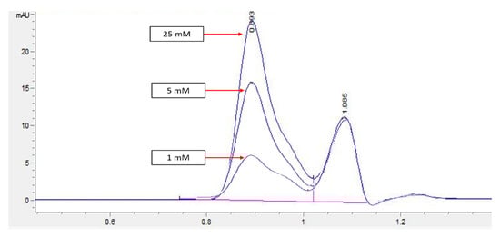 HPLC chromatogram profile for mimosine. Peak heights increased as the concentration of mimosine increased specifically at RT 0.9 min from 7.45 for 1 mM to 24.37 mAU for 25 mM. Key: y-axis: mAU, milli-absorbance unit; x-axis: min, minutes.