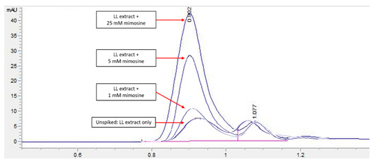 HPLC chromatogram profile for LL extract spiked with mimosine. An increase in the peak heights was apparent for all spiked samples compared to the unspiked LL extract, particularly at an RT of 0.9 min. Key: y-axis: mAU, milli-absorbance unit; x-axis: min, minutes.