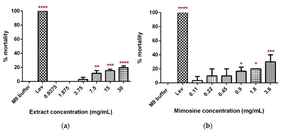 A dose-dependent increase in the percentage mortality of C. elegans was observed 24 h post-exposure to concentrations of LL extract and mimosine (Figure 5). For LL extract, the percentage of worm death increased from 0% in 0.9375 and 1.875 mg/mL to 19.59 ± 3.73% in 30 mg/mL. Worm mortality was statistically significant for 7.5, 15, and 30 mg/mL of LL extract when compared with the M9 buffer, which did not cause any worm death (Figure 5a). As for mimosine, a significant difference was observed in 0.9, 1.8, and 3.6 mg/mL, and the percentage of mortality increased from 3.33 ± 0.471% in 0.11 mg/mL to 30 ± 0.816% in 3.6 mg/mL (Figure 5b). The LC50 for LL extract and mimosine were estimated from linear regression equations and were calculated to be 73 mg/mL and 6.39 mg/mL (Table 3). The positive control, Lev caused 100% mortality and was significantly different from the M9 buffer.