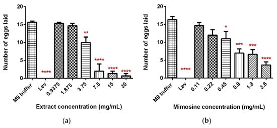 About 50 µL of each of the extract and mimosine concentrations were added into allocated wells in a 96-well plate, with M9 buffer and 100 µM levamisole acting as the respective negative and positive controls. Next, 5 synchronized gravid hermaphrodites were then added into each treatment and incubated at 22 °C for 4–6 h to allow the laying of eggs. The number of eggs laid and hatched was then counted. The assay was performed in triplicate.