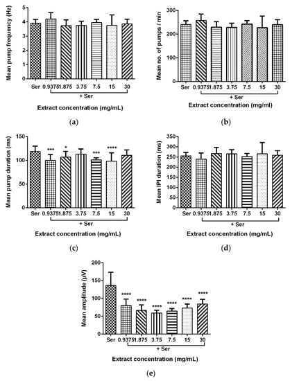 Effect of LL extract on pharyngeal pumping activity. (a) Mean pump frequency. (b) Mean number of pumps. (c) Mean pump duration. (d) Mean inter-pump interval (IPI) duration. (e) Mean pump amplitude. Data are presented as means ± SD and are compared to Ser as the standard pumping stimulus. Statistical significance was calculated using a two-way ANOVA with Dunnett’s multiple comparison test and is denoted by asterisks. * p ≤ 0.05; *** p ≤ 0.001; **** p ≤ 0.0001. n = 15 worms.