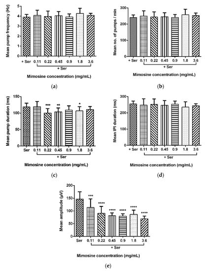 Effect of mimosine on pharyngeal pumping activity. (a) Mean pump frequency. (b) Mean number of pumps. (c) Mean pump duration. (d) Mean inter-pump interval (IPI) duration. (e) Mean pump amplitude. Data are presented as means ± SD and are compared to Ser as the standard pumping stimulus. Statistical significance was calculated using a two-way ANOVA with Dunnett’s multiple comparison test and is denoted by asterisks. * p ≤ 0.05; ** p ≤ 0.01; *** p ≤ 0.001; **** p ≤ 0.0001. n = 15 worms.