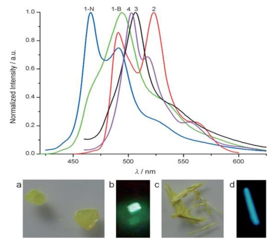 Top: solid-state emissions of complexes 15–18 at room temperature. Bottom: photographs of B-form and N-form crystals of 1 under natural light (a,c) and under 365 nm UV lamp (b,d).