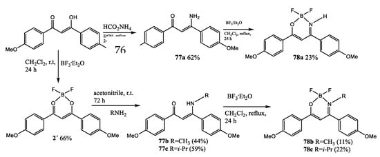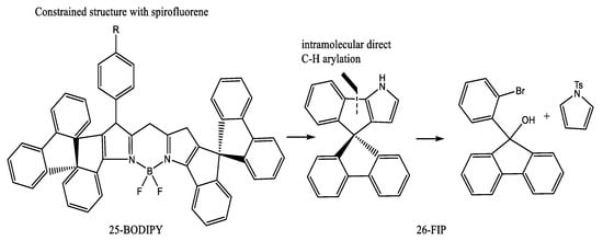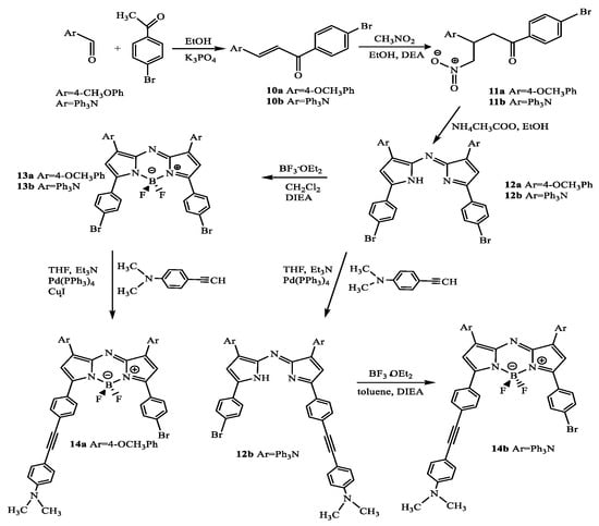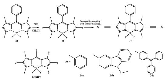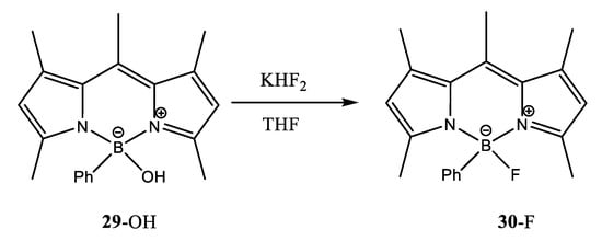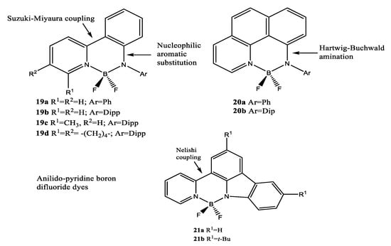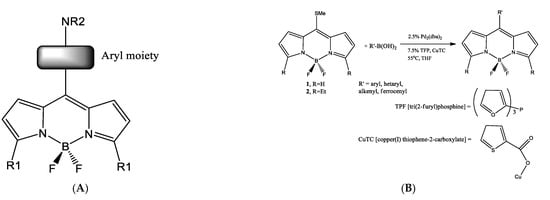 - Liebeskind–Srogl and Suzuki coupling: By a two-step sequence, a reaction to prepare meso-bromoaryl BODIPYs followed by coupling of these Bromine-containing BODIPYs with arylaminoboronic acids [30,31,32,33,34,35].