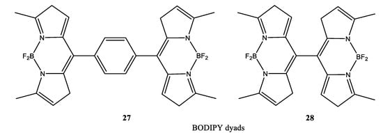 Besides, other aryl and hetaryl moieties in BODIPY compounds are widely reported. Three two-photon active boradiazaindacene derivatives 2,6-di-phenylacetylenyl-1,3,5,7-tetramethyl-8-phenyl-4,4-difluoroboradiazaindacene (Figure 4, 24a), 2,6-di-9-ethyl-9H-carbazole-3-ethynyl-1,3,5,7-tetramethyl-8-phenyl-4,4-difluoroboradiazaindacene (Figure 4, 24b) and 2,6-di-4-N,N-diphenyl-phenylacetyleny l-1,3,5,7-tetramethyl-8-phenyl-4,4-difluoroboradiazaindacene (Figure 4, 24c) in THF solutions were studied by using femto-second laser spectroscopic techniques [47]. The two-photon fluorescence imaging experiment on these compounds exhibit good cell permeability, nontoxicity, and excellent two-photon fluorescence properties. Structurally rigid BODIPY having spirofluorene moieties [48] (Figure 5) were reported that exhibit intense bathochromic fluorescence. These rigid structures give high quantum yield of photoluminescence and decreased nonradiative decay of excited states. DFT calculations indicated that spiro-conjugation leads to delocalization of the π-system of BODIPY derivatives over the fluorene moieties as well as the BODIPY core. Moreover, symmetric BODIPY dyads (Figure 6) have chromophores at the meso position through phenylene bridge or direct linkage [49]. In excited state, these molecules will undergo symmetry-breaking through ICT state. Due to differences in degree of rotational freedom, these dyads will show different behavior of the ICT state. Whereas dyad 25 undergoes rapid nonradiative decay to the ground state, the more hindered dyad 26 has a long-lived ICT state with moderate-to-high fluorescence quantum efficiency. The excited state properties of these dyads could prove useful in facilitating charge separation in photovoltaic devices.