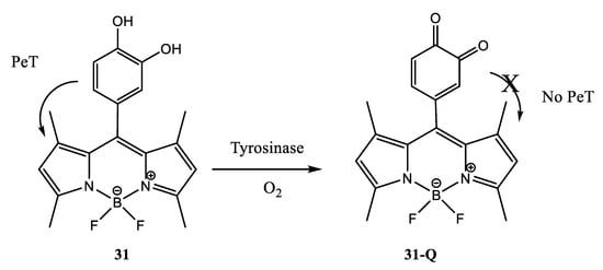 Introduction of radiotracers in BODIPY compounds is also known [50]. The rapid nucleophilic [18F]-radiolabeling of a BODIPY dye in aqueous solutions is reported (Figure 7). This radiolabeled dye was found to be stable in vivo and used as a dual modality imaging agent. Besides several applications of BODIPY compounds, we elucidate that the BODIPY-based fluorescent probe 31 can be used for the selective detection (Figure 8) of tyrosinase (a copper-containing enzyme catalyzing the hydroxylation of phenol derivatives, such as tyrosine or tyramine, which is widespread in plants and animal tissues) activity in buffered aqueous solution [51], is suitable for screening potential inhibitors of tyrosinase, as well as for bioimaging intracellular tyrosinase activity in living cells.