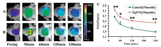 Representative images of Tg2576 mice and control littermates at different time points before and after intravenous injection of 5.0 mg/kg CRANAD-2. (A) 19-month-old control mouse; (B) 19-month-old Tg2576 mouse (mice showed similar background fluorescence signal); (C) the relative fluorescence signal [F(t)/F(pre)] was significantly higher than that of the control mice, and the decay of fluorescence signal was significantly slower in transgenic mice compared with the control group (*: p = <0.005, **: p = <0.01).