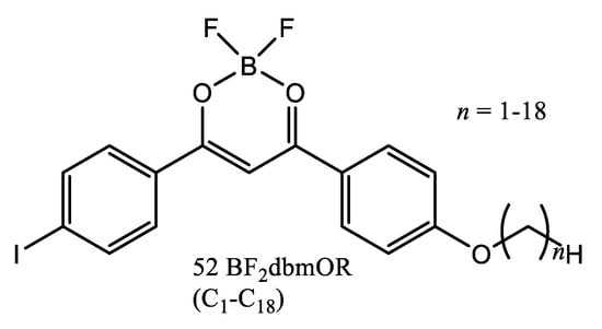 Surprising process-dependent and reversible mechanochromic fluorescence was discovered for the boron dodecane complex (BF2dbmOC12H25) (Figure 11)—a difluoroboron dibenzoylmethane dye coupled to a lipid chain [59]. A thermally annealed spin-cast film of the lipid dye on glass exhibited blue fluorescence under UV light; however, after shearing or scratching, the mechanically perturbed region turned yellow–green. The blue coloration could be rapidly recovered by thermal treatment of the film [60]. In order to test the effects of alkyl chain length on solid-state photoluminescence and reversible mechanochromic luminescence (ML) in difluoroboron β-diketonate dyes, a series of dyes, BF2dbmOR, with dibenzoylmethane (dbm) ligands and alkoxyl substituents (–OR) were prepared [61], where R = CnH2n+1 and n = 1, 2, 3, 5, 6, 12, 14, 16, 18 (Figure 12). Fluorescence spectra and lifetimes were found to be nearly identical for dyes in CH2Cl2 solution; whereas, emission maxima and lifetimes were different among the samples in the solid state as powders, thin films, or spin cast films, The recovery time generally increased with alkyl chain length, ranging from minutes (n = 3) to days (n = 18). Longer chain analogues (n ¼ 6, 12, 14, 16, 18) did not fully return to the original annealed emissive state even after months on quartz, though the dynamics are substrate-dependent.