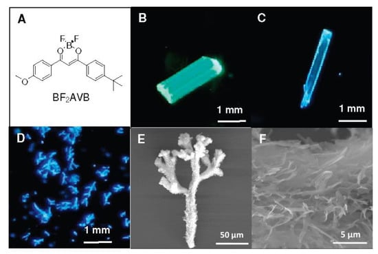 The difluoroboron avobenzone complex (BF2AVB) (Figure 13) is commercially available and used as an ingredient in sunscreen products because of its strong absorption of UVA light (320–400 nm) was synthesized via BF3·OEt2 boronation in CH2Cl2 avobenzone [62]. Unlike BF2dbm(s) derivatives that typically exhibit strongly red-shifted and significantly broadened fluorescence spectra, BF2AVB(s) showed unexpectedly sharp emission spectra that can be tuned via the solid form, such as single crystals, dendritic solid, or spin-cast film (Figure 14). The fluorescence color was found to be dramatically altered after crushing or physically smearing BF2AVB crystals or upon scratching or rubbing annealed film samples.