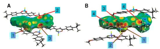 Crystal packing for (A) green and (B) cyan BF2AVB crystals, showing Hirshfeld surfaces of the central molecules mapped with de. The most significant intermolecular interactions are as follows: (A1) C(arene)-H· · · F hydrogen bond; (A2) C(methyl)-H· · ·π interaction; (A3) short H· · ·H contacts; (B1, B2) C(arene)-H· · ·F hydrogen bonds; (B3) C(methyl)-H· · ·O hydrogen bond; (B4) short H· · ·H contacts.