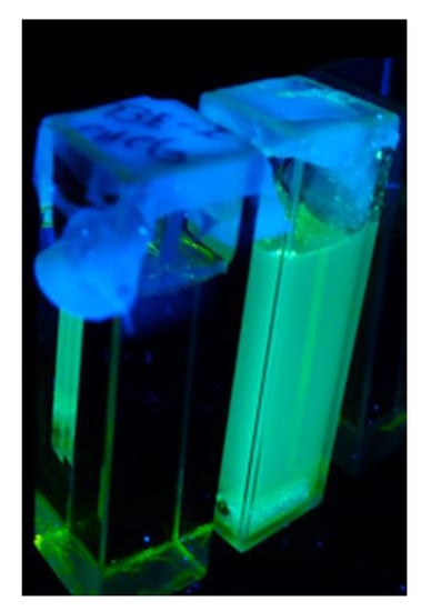 Photoluminescence from boronate 56b in a chloroform solution (left in the picture) and from a colloidal solution of nanocrystals (right in the picture). Fluorescence was obtained under excitation at 370 nm.