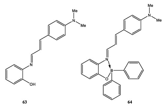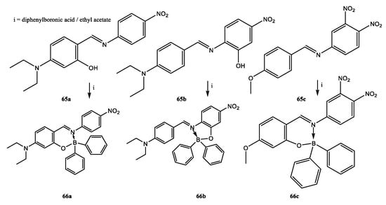 N,O-containing bororganic compounds are also common [66]. Thus, four diboron-contained ladder-type π-conjugated compounds 57–60 (Scheme 12) were designed and synthesized [67]. Compounds 57 and 58 possess high thermal stabilities, moderate solid-state fluorescence quantum yields, as well as stable redox properties, indicating that they are possible candidates for emitters and charge-transporting materials in electroluminescent devices. The third-order nonlinear optical characterization of a boronate (58)—prepared from the reaction of diphenylboronic acid and the bidentate ligand (57)—derived from 4-dimethylaminocinnamaldehyde (Figure 18), was performed by third-harmonic generation (THG) at the infrared wavelength of 1550 nm [68]. The results showed that the N→B coordinative bond facilitates the polarization of the electronic π-system, a situation that optimizes the third-order nonlinear optical (NLO) response. In addition, three boron complexes (65a–65c) were prepared by the reaction of bidentate ligands (66a–66c) and diphenylboronic acid (Scheme 13) [69]. Compounds 58a and 58c were found to have a nonplanar conformation for the main p-backbone, acquired after boron complexation; for compound 58b, the planar conformation is preserved.