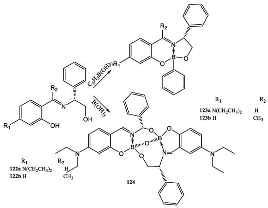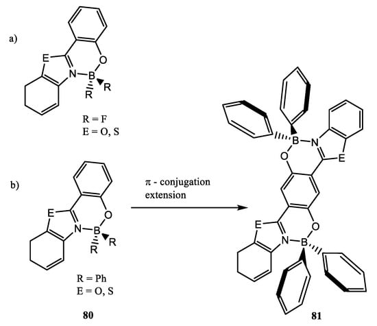 - Vidyasagar, C.C.; Muñoz Flores, B.M.; Jiménez-Pérez, V.M.; Gurubasavaraj, P.M. Recent advances in boron-based schiff base derivatives for organic light-emitting diodes. Mater. Today Chem. 2018, 11, 133–155. [Google Scholar] [CrossRef]