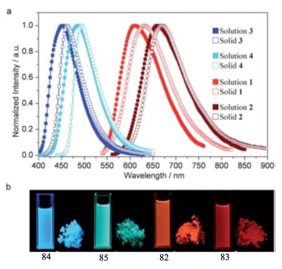 - Li, D.; Wang, K.; Huang, S.; Qu, S.; Liu, X.; Zhu, Q.; Zhang, H.; Wang, J.Y. Brightly fluorescent red organic solids bearing boron-bridged π–conjugated skeletons. Mater. Chem. 2011, 21, 15298–15304. [Google Scholar] [CrossRef]