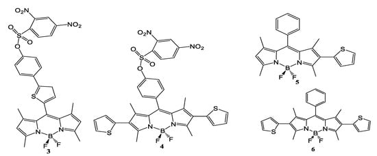 Based on DFT calculations [36,37,38], it was proposed that the large Stokes shifts of 3, 4, and 5 (Scheme 2) are due to the remarkable geometry relaxation upon photoexcitation and its substantial effect on the energy levels of molecular orbitals. For the dyes with small Stokes shifts, much smaller geometry relaxations were found [39,40,41].