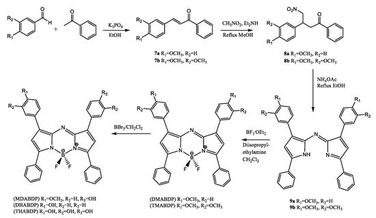 Several research groups reported [42] the detailed synthesis and reactions of aza-boron-dipyrromethene (Aza-BODIPY) compounds (Scheme 3) containing methoxy and hydroxyl groups. The study on linear absorption spectra for phenolate forms of aza-BODIPY containing hydroxyl group exhibited drastic changes and showed new bands for phenolate groups in the region below 500 nm and above 700 nm in THF solutions. In addition, no fluorescence signals were observed with 600 nm excitation for phenolate forms. Moreover, these hydroxyl group (HABDP)-containing azo-BODIPY compounds revealed two photon absorption properties at 1200–1450 nm spectral range [43].