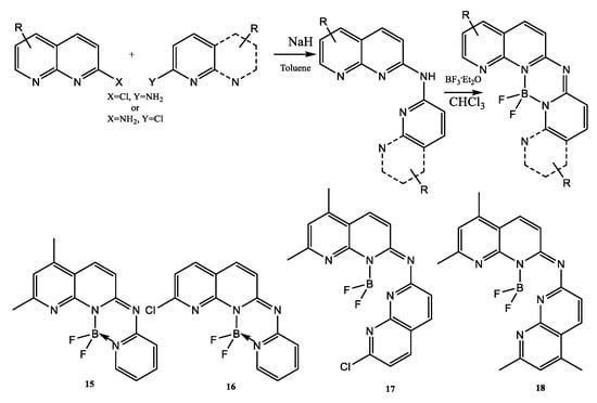 Additionally, 1,8-naphthyridine–BF2 complexes 15–18 were synthesized (Scheme 5); these are known for their good fluorescence properties. These complexes contain one N atom less between naphthyridine moieties that have strong emissions in the solid state (Figure 1) [45]. Both naphthyridine and pyridine units in their structure are ligated to the BF2 core as monodentate ligands, and the two aromatic units are nearly coplanar with dihedral angles of 4.91 and 2.968 for the B-and N-form crystals, respectively. SEM and TEM images of 17 showed that it consists of tangled nanowires of width about 30 nm and lengths varying from several hundred nanometers to several micrometers (Figure 2).