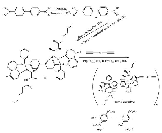 - Matsumi, N.; Chujo, Y. Synthesis of π-Conjugated Poly(cyclodiborazane)s by Organometallic Polycondensation. Macromolecules 2000, 33, 8146–8148. [Google Scholar] [CrossRef]