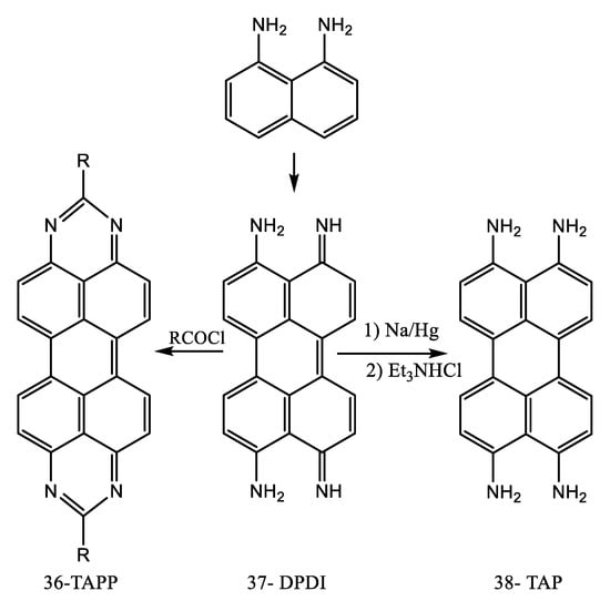 Synthesis of 4,9-diaminoperylenequinone-3,10-diimine(DPDI), 1,3,8,10-tetraazaperopyrene (TAPP), and 3,4,9,10-tetraaminoperylene(TAP).