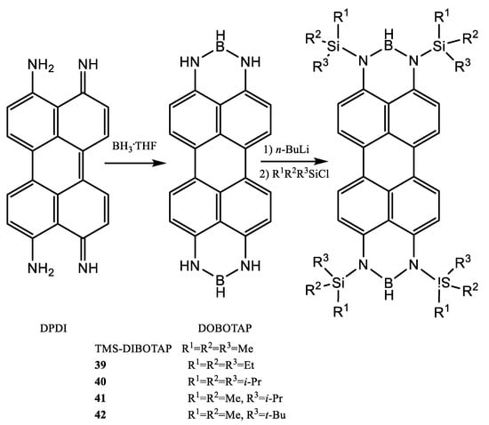 Some NBN-environment-based organoboron compounds have also been reported with a wide variety of applications. Thus, optically active organoboron aminoquinolate-based coordination polymers bearing the chiral side chain derived from L-alanine were synthesized (Scheme 6) and their optical behavior was studied by UV–Vis and photoluminescence spectroscopies [52]. The hydrogen-bonding in these polymers was found to be stable in solvents such as CHCl3 and DMF studies of circular dichroism (CD). Intramolecular charge transfer was observed due to the fact of solvents polarity. Further, some toxic compounds such as Triphenyl borane were studied (Figure 9). The toxicity of the alternative organotin (Ot) antifoulants TPBP (triphenylborane pyridine; Figure 9: 34) and TPBOA (triphenylborane octadecylamine; Figure 9: 35) and their degradation products on Crassosteagigas and Hemicentrotuspulcherrimus were tested [53]. Silylated-diborylene-3,4,9,10-tetraaminoperylenes (DIBOTAPs, compounds 39–42) were synthesized by treating 4,9-diaminoperylenequinone-3,10-diimine (DPDI, Scheme 7) with BH3–THF, lithiation with n-butyllithium, and subsequent addition of the corresponding silyl chloride (Scheme 8) [54]. In all cases, the perylene backbones were found to be not completely planar. The coordination of the nitrogen donor atoms to the Lewis acidic boron atoms stabilizes the tetraaminoperylene core, while the N-silylation appears to suppress aggregation in solution. The latter enables the high luminescence quantum yields. The exchange of all three methyl groups with ethyl (compound 39) or isopropyl (compound 40) substituents resulted in a significant increase in quantum yields with values of 92% and 89%, respectively. The observed fluorescence decay is monoexponential for all dyes with typical lifetimes of 5.5–6.6 ns.