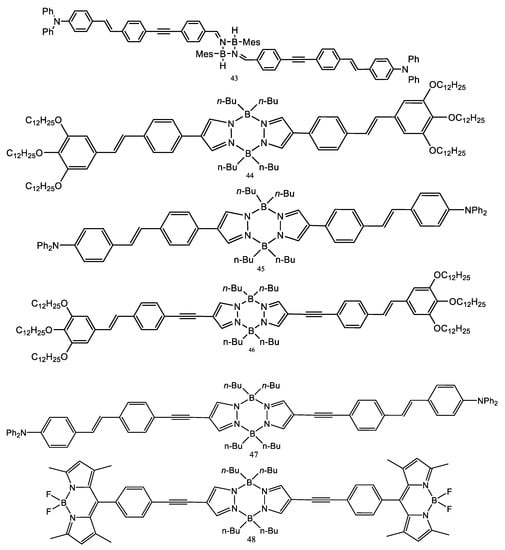 To conclude, 1D boron containing two-photon absorbing fluorophores with two boron-containing central cores (with two boron atoms)—the cyclodiborazane and the pyrazabole moieties—were reported (Scheme 9) [55]. All compounds present a strong two-photon induced fluorescence and have been used in microscopy to visualize cancerous HeLa cells. High boron content should be of great interest to study the mechanism of boron neutron capture therapy by deep imaging in small animals with micrometric resolution by two-photon excited fluorescence.