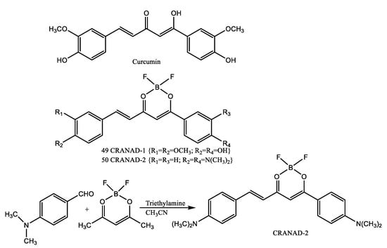 - Ran, C.; Xu, X.; Raymond, S.B.; Ferrara, B.J.; Neal, K.; Bacskai, B.J.; Medarova, Z.; Moore, A. Design, Synthesis, and Testing of Difluoroboron-Derivatized Curcumins as Near-Infrared Probes for in Vivo Detection of Amyloid-β Deposits. J. Am. Chem. Soc. 2009, 131, 15257–15261. [Google Scholar] [CrossRef] [PubMed]