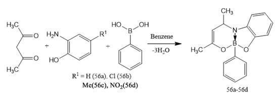 Synthesis of O-B-N Boronates 56a–56b in one step from the reaction of 2,4-pentanedione, aminophenol, and phenylboronic acid.