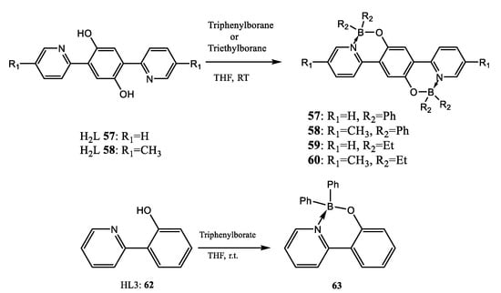 Synthesis of N,O-containing bororganic compounds 57–60.