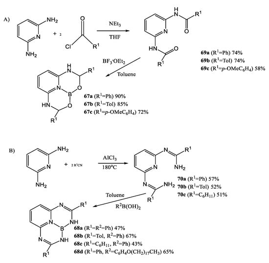 A series of fluorescent boron systems 67a−67c and 68a−68d based on nitrogen (NNN) or nitrogen and oxygen (ONO)-containing tridentate ligands were prepared (Scheme 14) [70]. They showed large Stokes shifts (mostly above 3200 cm−1) and quantum yields in solution and in the solid state up to 40%. Introducing a long alkyl chain with a phenyl spacer at this axial position enables the self-assembly of the boron compound 68d to form a fluorescent vesicle, which is able to encapsulate small molecules such as sulforhodamine. Additionally, boron compound 68d was found to serve as a dye for cell imaging since it has the capability of binding to the nuclear membrane cells. A boron complex bearing a pyrene ligand (CPB) as fluorophore was synthesized (Scheme 15) and introduced as the first example of a binuclear boron complex inorganic light-emitting diode [71]. Complex CPB exhibited strong red-light emission in the solid state. In the polymer light-emitting diodes fabricated with the CPB complex blended with PVK, red emission could be achieved easily by tuning the weight concentration of CPB.