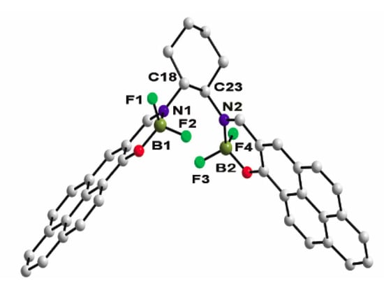 - Rodríguez, M.; Maldonado, J.L.; Ramos-Ortíz, G.; Domínguez, O.; Ochoa, M.E.; Santillan., R.; Farfán, N.; Meneses-Nava, M.; Barbosa-García, O. Synthesis, X-ray diffraction analysis, and chemical–optical characterizations of boron complexes from bidentate ligands. Polyhedron 2012, 43, 194–200. [Google Scholar] [CrossRef]