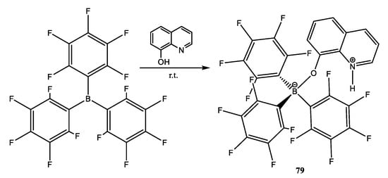 A series of boron ketoiminate derivatives that exhibited clear aggregation-induced emission (AIE) characteristics (in THF, FPL =0.01; in the solid state, FPL = 0.30–0.76) were prepared by the reactions of 1,3-enaminoketone derivatives with boron trifluoride–diethyl etherate (Scheme 16) [72,73,74,75,76,77,78,79,80,81,82,83]. The boron ketoiminate units can be applied as a new building block of various AIE-active materials. The reaction of 8-hydroxyquinoline (HQ) with B(C6F5)3 led [84,85,86,87,88] to the formation of the zwitterionic compound (C6F5)3BQH (Scheme 17). On the basis of these and other results, it was shown that fluorination of the phenyl rings results in a stabilization of both the HOMO and LUMO levels; therefore, the effect on the absorption and emission maxima in the UV–Vis and PL spectra, respectively, is only minimal. However, the difference in stability and volatility between fluorinated and unfluorinated luminescent boron compounds may have an effect on their solid-state properties and their performance in OLED devices.