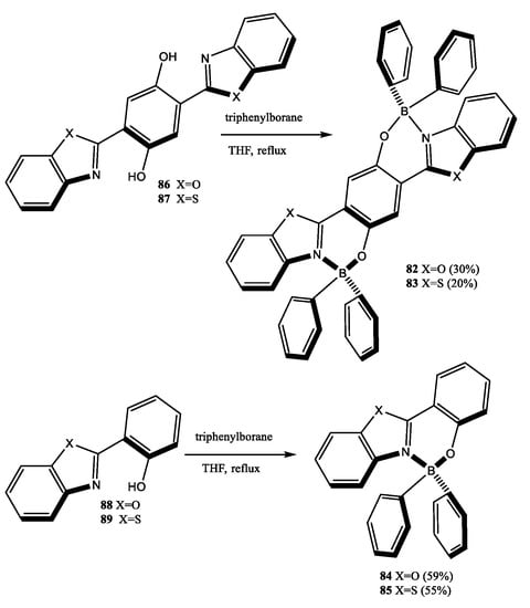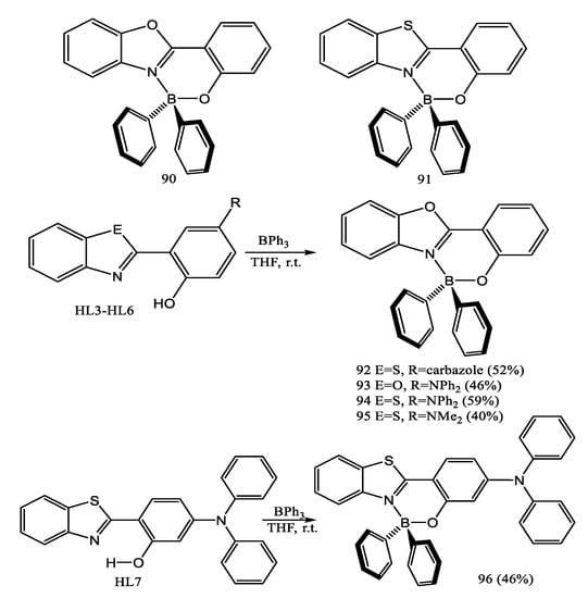- Hellstrom, J.S.; Britovsek, G.J.P.; Jones, T.S.; Hunt, P.; White, A.J.P. Synthesis and characterisation of luminescent fluorinated organoboron compounds. Dalton Trans. 2007, 14, 1425–1432. [Google Scholar] [CrossRef]