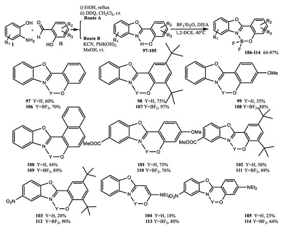 - Massue, J.; Denis, F.; Ulrich, G.; Retailleau, P.; Ziessel, R. Synthesis of Luminescent 2-(2′-Hydroxyphenyl)benzoxazole (HBO) Borate Complexes. Org. Lett. 2012, 14, 230–233. [Google Scholar] [CrossRef] [PubMed]