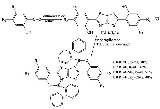 - Matsumi, N.; Umeyama, T.; Chujo, Y. π-Conjugated poly (cyclodiborazane) s with intramolecular charge transferred structure. Macromolecules 2000, 33, 3956–3957. [Google Scholar] [CrossRef]