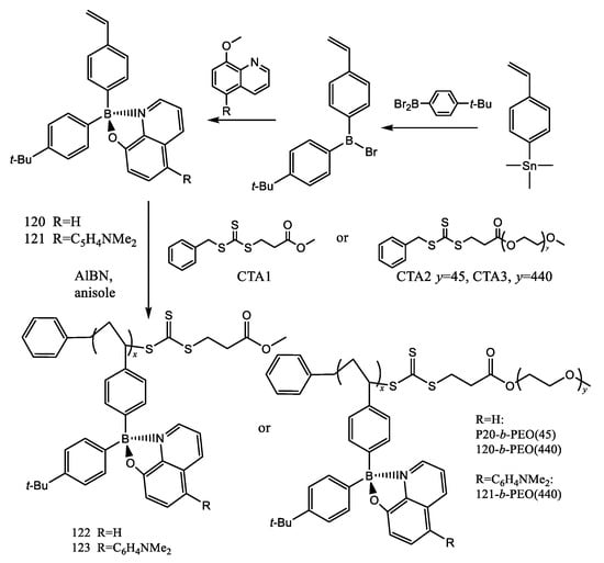 - Cheng, F.; Jäkle, F. RAFT polymerization of luminescent boron quinolate monomers. Chem. Commun. 2010, 46, 3717–3719. [Google Scholar] [CrossRef]