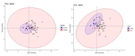 2.3. Elemental Contents in Salt-Treated Roots and Leaves Compared with the Corresponding Control
