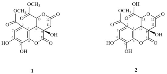 Compound 1 was obtained as a white powder with the molecular formula C16H14O11, as determined by the HRESIMS data ([M-H]− m/z 381.0442; calcd 381.0452) and supported by the presence of 16 carbon signals in its 13C-NMR spectrum. The UV spectrum of 1 showed absorption maxima at 223, 277, and 310 nm. The IR spectrum showed absorption peaks for hydroxy (3364 cm−1) and carbonyl groups (1749 and 1695 cm−1). The 1H-NMR spectrum showed one aromatic proton signal at δ 7.19 (1H, s), two methine proton peaks at δ 5.41 (1H, d, J = 1.2 Hz) and δ 4.80 (1H, d, J = 1.2 Hz), one methylene proton peak at δ 3.29 (1H, d, J = 16.8 Hz) and δ 3.16 (1H, d, J = 16.8 Hz), and a singlet of two methoxy groups at δ 3.89 (3H, s) and δ 3.79 (3H, s) (Table 1). The 13C-NMR spectrum combined with the HMQC experiments indicated the presence of one methylene carbon (δ 36.3), two methine carbons (δ 48.3, 79.1), two methoxy groups (δ 51.4, 53.0), one oxygenated quaternary carbon (δ 88.0), six aromatic carbons (δ 112.1, 116.8. 119.9, 134.9, 147.2, 147.9) and four ketones (δ 166.5, 169.1, 170.5, 170.9) (Figure 2). The 1H-1H COSY correlation was observed for the H-10/H-13 spin system. In the HMBC spectrum, the position of the methoxy carbonyl group at C-2 was elucidated by the HMBC correlations from δ 7.19 (H-7) to δ 166.5 (C-1) and δ 119.9 (C-3) and from δ 3.89 (OCH3) to δ 166.5 (C-1). Another methoxy carbonyl group at C-13 was confirmed using the HMBC correlations of δ 5.41 (H-13) to δ 48.3 (C-10), δ 88.0 (C-9), δ 119.9 (C-3), δ 170.5 (C-14) and δ 170.9 (C-12), and of δ 3.79 (OCH3) to δ 170.5 (C-14). Furthermore, the linkage of the two lactone rings was confirmed using the HMBC correlations of δ 5.41 (H-13) to δ 48.3 (C-10), δ 88.0 (C-9), δ 119.9 (C-3), and δ 170.9 (C-12), of δ 4.80 (H-10) to δ 119.9 (C-3) and δ 147.9 (C-4), and of δ 3.16 and δ 3.29 (CH2-11) to δ 48.3 (C-10), δ 88.0 (C-9), and δ 169.1 (C-8) (Figure 3). Based on the above structural evidence, the planar structure of 1 was established. The relative configuration of 1 was deduced by analyzing its NOESY data, in which the correlations of δ 5.41 (H-13) and δ 4.80 (H-10) indicated close spatial proximity (Figure 4); thus, the compound was assigned as β-oriented. Therefore, the structure of compound 1 was determined as shown in Figure 1, and it was named euphormin-A.