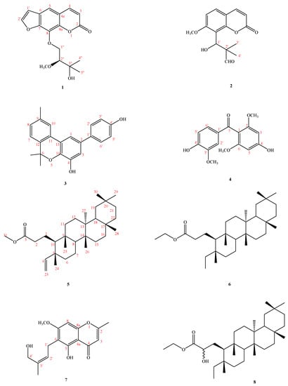 - Wu, T.S.; Liou, M.J.; Kouh, C.S. Coumarins of the flowers of Murraya paniculata. Phytochemistry 1989, 28, 293–294. [Google Scholar] [CrossRef]