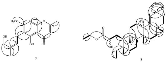 Compound 7 was obtained as colorless oil. The molecular formula was determined to be C16H18O5 from the quasi-molecular ion peak [M + H]+ at m/z 290.1144 by HR-EI-MS (calcd. for C16H18O5Na, 290.1154), corresponding to 8 degrees of unsaturation. The IR spectrum exhibited absorptions of a strong intermolecular hydrogen bonding at 3416 cm−1 and a conjugated carbonyl group (1660 cm−1). The 1H and 13C NMR data (Table 1) displayed the presence of mono-substituted benzene signals [δH 6.38 (1H, s, H-8)/δC 162.1 (C-7), 157.4 (C-5), 156.0 (C-8a), 111.4 (C-6), 105.0 (C-4a), and 89.7 (C-8)], an olefinic methine [δC/δH 108.6/6.03 (1H, s, H-3)], an olefinic methyl [δC/δH 20.9/2.34 (3H, s, CH3-2)], a carbonyl carbon signal (δC 181.7, C-4), and a carbon signal (δC 165.9, C-2). Furthermore, the characteristic UV absorption signals at 291, 256, and 232 nm for the chromone skeleton and the above-mentioned NMR data indicated that compound 7 showed signals and coupling patterns similar to those of cnidimol A [19]. The molecular formula C16H18O5 of 3 displayed more 14 units than cnidimol A, and NMR data was presented a methoxy group [δC/δH 56.1/3.89 (3H, s, OCH3-7). In the HMBC spectrum, the deshielded methylene protons H-1′ (δH 3.40) showed the correlations to the quaternary carbons at C-3′ (δC 134.8), C-6 (δ 111.4), C-5 (δC 157.4), and C-7 (δC 162.1), whereas the olefic proton at H-2′ (δH 5.32) was correlated to methylene carbon at C-1′ (δC 21.4) and oxymethylene at C-4′ (δC 61.7), and the methyl proton at H-5′ (δH 1.77) was correlated with C-2′ (δC 124.7), C-3′ (δC 134.8), and C-4′ (δC 61.7). Thus, the data indicated a hydroxyprenyl at C-6. Moreover, the HMBC spectrum featured cross peaks long-range correlations from H3-7 (δH 3.89) to C-7 and from CH2-4′ (δH 4.25) to C-3′ (δC 134.8), suggesting the methoxy group at C-7 and a hydroxyethyl group at C-3′. In the NOESY spectrum of 7, there was a correlation between the protons of 4′. In the NOESY spectrum of 7, a correlation between the protons of H-2′/H-5′ and H-1′/H-4′ provided evidence for the (2′Z)-geometry (Figure 1), which was also confirmed by the chemical shift for 5′-CH3 (δC 22.5) [20,21]. Therefore, compound 7 was 5-hydroxy-6-[(2′Z)-4′-acetoxy-3′-methylbut-2′-enyl]-7-methoxy-2-methylchromone [22].