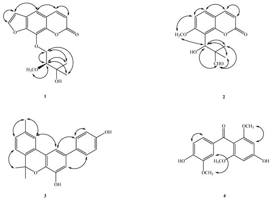 These two phenyl moieties were connected by a C=O group [δC 194.2 (C-7)]. The HMBC spectrum (Figure 2) revealed correlations between H-2′ (δH 7.59), H-6′ (δH 7.22)/C-7 (δC 194.2), OCH3-3′ (δH 3.93)/C-3′(δC 146.5), OCH3-2 & 6 (δH 3.63)/C-2 & 6 (δC 158.6), H-5′ (δH 6.84)/C-1′ (δC 131.1), C-3′ (δC 146.5), C-4′ (δC 150.5), H-6′ (δH 7.22)/C-2′ (δC 110.1), C-4′ (δC 150.5), C-7 (δC 194.2), H-2′ (δH 7.59)/C-4′ (δC 150.5), C-6′ (δC 126.2), C-7 (δC 194.2), H-3 (δH 6.08)/C-1 (δC 110.4), C-2 (δC 158.6), C-4 (δC 158.5), and C-5 (δC 92.0). This result was further supported by the key NOESY data (Figure 3), i.e., by the correlations δH 7.59 (H-2′)/OCH3-3′ (δH 3.93), δH 7.22 (H-6′)/6.84 (H-5′), and δH 6.08 (H-3)/OCH3-2 (δH 3.63). Thus, the biphenylpropanoid structure of 4 was elucidated as 4,4-dihydroxy-2,6,3′-trimethoxy-benzophenone, which was confirmed by DEPT, COSY, HSQC, NOESY (Figure 2) and HMBC (Figure 1) experiments, and was named herbidosporadalin D.