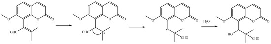 The associations of the HMBC signals are as follows: H-1′ (δH 5.52) is associated with C-7, 8, 9; δH 9.71 (s) is associated with C-2′, 3′, 4′; and it was determined that the branched chain of compound 2 contains a tert-butyl group, and the mass peak at m/z 205 (100) seen in the EI-MS spectrum was presumed to be the fragment of the molecular parent peak removed -CCHO(CH3)2-. Compound 2 is as follows: 7-methoxy-8-(1-hydroxy-2,2-dimethyl-3-oxopropyl)coumarin, designated as herbidosporadalin B. Tertiary butyl is very rare in nature, and it has been found in compounds isolated from Ginkgo biloba in the past. The structure of 1 is a quite interesting new skeleton, and its possible biosynthesis pathway is speculated, as shown in Scheme 1.