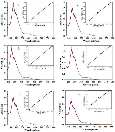 Electron spectroscopy is one of the most widely used techniques to evaluate the binding ability between metal complexes and DNA. UV–vis spectra titration experiments were conducted to further clarify the binding behavior of these complexes with c-myc G-quadruplex DNA. Figure 2 shows the UV–vis spectra of Ru(II) complexes with and without c-myc G-quadruplex DNA in a Tris-HCl-KCl buffer. The electronic spectra of these arene Ru(II) complexes showed a characteristic absorption at approximately 275 nm, which can be attributed to the intraligand (IL) charge transfer, and the MLCT peak observed at about 386 nm can be attributed to metal-to-ligand charge transfer (MLCT) absorption. Upon the addition of c-myc G-quadruplex DNA, it was observed that the absorption peak of the compound decreased and there was an obvious hypochromic effect. The calculated hypochromic rates for 1, 2, 3, 4, 5, and 6 at the IL absorption band were approximately 7.13%, 7.55%, 5.46%, 6.15%, 8.83%, and 7.50%, respectively. The intrinsic equilibrium binding constants (Kb) calculated for 1, 2, 3, 4, 5, and 6 with c-myc G-quadruplex were approximately 67.5, 110, 134, 48.3, 41.1, and 14.6 × 106 M−1, respectively. Moreover, the complex without the F atom exhibited a weak affinity to c-myc G-quadruplex DNA, and there were tiny changes in the hypochromic effect (3.5%) with the binding energy of 1.5 × 105 M−1. However, with the introduction of the F atom in the terminal benzene ring at the para-position, the complex displayed an obvious hypochromic effect (7.1%) with a binding energy of 6.4 × 105 M−1 (Figure S22). These data are comparable with that of arene ruthenium complexes [(η6-C6H6)RuCl(pmpzdpm)] (4.29 × 105 M−1) and [(η6-C10H14)RuCl(pmpzdpm)] (1.79 × 106 M−1) (pmpzdpm = 5-(2-pyrimidylpiperazine)phenyldipyrromethane) [18] and [Ru(bpy)2ASC]2+ (2.78 × 106 M−1) (ACS = ascididemin) [19].