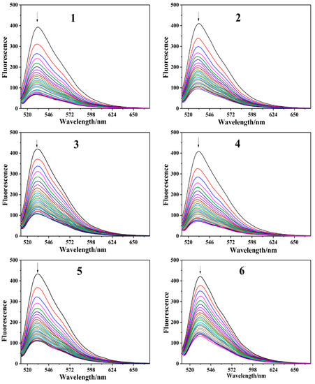 As shown in Figure 3, TO-DNA emits a strong fluorescence at 512–680 nm when it is excited at 501 nm. With the increase in arene Ru(II) complexes to the TO-DNA, the fluorescence intensity gradually decreases following the increase in arene Ru(II) complexes. This condition is due to the competitive relationship between the arene Ru(II) complexes and the TO bound in the TO-DNA. Table 1 shows the DC50 values obtained from all FID analyses. As shown in Figure 4, the DC50 values of 1, 2, 3, 4, 5, and 6 were 6.6, 9.93, 10.26, 7.8, 10.8, and 15.6 µM respectively. The above results indicate that these arene Ru(II) complexes have some capacity to bind to c-myc G-quadruplex DNA, especially complex 1, which had the strongest capacity.