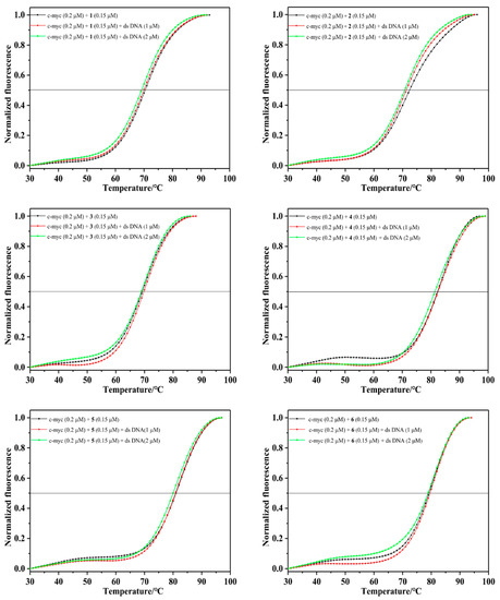 Normalized FRET melting curves of c-myc G-quadruplex DNA (0.2 μM) in a K+ buffer, with increasing concentrations (0–0.3 μM) of Ru(II) complexes (1–6) measured by real-time polymerase chain reaction PCR system.