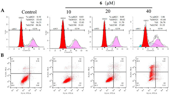 S-phase arrest (A) and apoptosis (B) of U87 cells induced by 6 for 72 h tested by flow cytometric analysis.