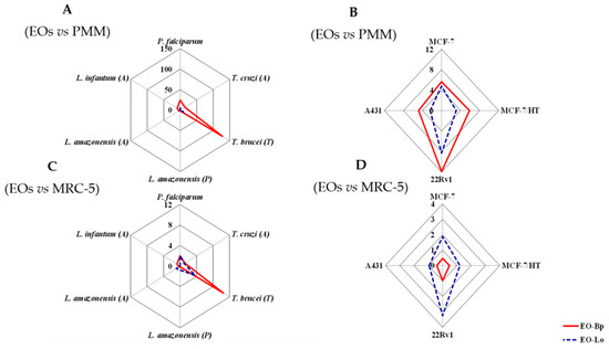 Selective indexes of essential oils from Baccharis parvidentata and Lippia origanoides from Brazil. (A) Antiprotozoal activity of EOs in comparison with cytotoxicity against PMM; (B) antiproliferative activity against malignant cells by EOs in comparison with cytotoxicity against PMM; (C) antiprotozoal activity of EOs in comparison with cytotoxicity against MRC-5; (D) antiproliferative activity against malignant cells of EOs in comparison with cytotoxicity against MRC-5. EOs: essential oils from Baccharis parvidentata and Lippia origanoides; EO-Bp: essential oil from Baccharis parvidentata; EO-Lo: essential oil from Lippia origanoides; PMM: peritoneal macrophage from BALB/c mice; MRC-5: human fetal lung fibroblast cells line.