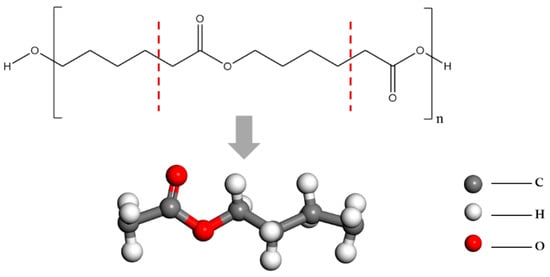 Since our research focuses on the mechanism of action between the functional groups in PCL and HA, we refer to the method of studying the polymer and crystal surface adsorption by Ian Streeter et al. []. We selected a segment of the PCL polymer for examination, which included all the functional groups of PCL: a carbonyl group, an ether bond, and an alkane chain (Figure 1).