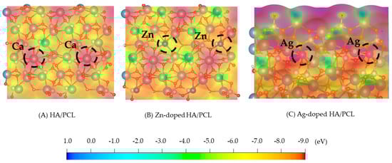 As shown in Figure 3, there are two areas of negative ESP, O1 and O2, on the surface of PCL, which can be bound to the positive Ca atoms on the surface of HA. Of these, O1 has the highest negative ESP. Therefore, theoretically, when PCL interacts with the pure and doped HAs, O1 in PCL can easily form coordinate bonds with Ca, Zn, and Ag atoms in HA.