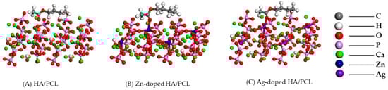 An isomorphic replacement of multiple ions, such as Zn, Ag, Mg, and Sr ions, can be performed in HA. Substitutions affect the stability [,,], antibacterial properties [,], biological activity [,,,], and bonding properties [] of HA. Sun et al. found that doping with Zn and Ag atoms significantly improved the bonding strength of HA and Ti []. Therefore, this research proposes a new method of improving the adhesion between PCL and HA by doping with Zn or Ag atoms. With the development of density functional theory and computer performance, the accuracy of DFT calculation has been greatly improved, because DFT calculation can intuitively show the interaction mechanism between molecules. It plays an important role in materials science. At present, computational simulation methods can not only study existing materials, but also predict new materials. The purpose of this study was to investigate the mechanism of adsorption of PCL, occurring via the functional groups in PCL, onto pure HA, Zn-doped HA, and Ag-doped HA based on density functional theory (DFT), to provide a theoretical basis for improving the adhesion strength between PCL and HA.